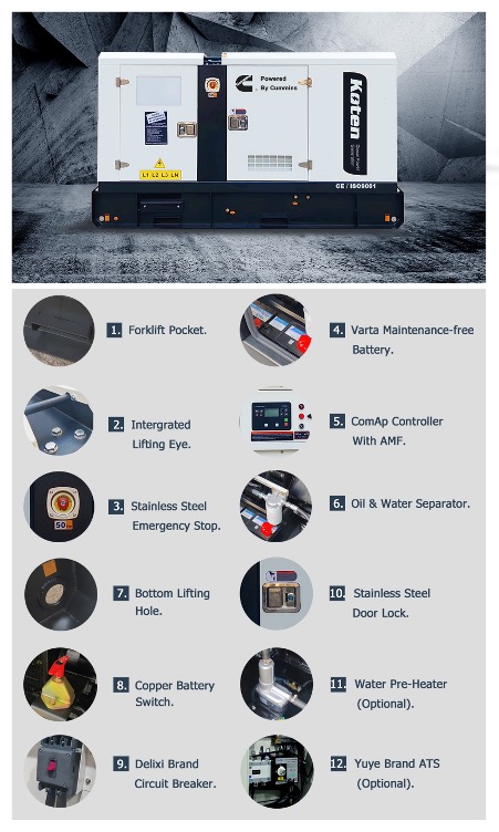 - Genset คู่กับเครื่องยนต์ Cummins ดั้งเดิมพร้อมไส้กรองอากาศสำหรับงานหนัก ไส้กรองน้ำมัน ไส้กรองเชื้อเพลิง เชื้อเพลิงและตัวแยกน้ำ เครื่องกำเนิดไฟฟ้ากระแสสลับแบบไร้แปรงยี่ห้อ Koten มาตรฐาน เครื่องกำเนิดไฟฟ้าสำรองสำหรับ Stamford, Leroy Somer, Marathon, Meccalte